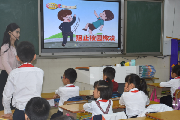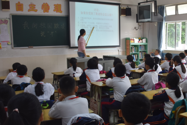 當(dāng)天早上,學(xué)校通過(guò)國(guó)旗下講話、校園廣播等形式,引導(dǎo)學(xué)生了解校園欺凌事件的預(yù)防知識(shí)和處理方式。上午第一節(jié),各班在教室里開展了形式多樣的班會(huì)活動(dòng)。各班在班主任的精心組織下,有的觀看了《預(yù)防校園暴力,共建和諧校園》專題教育片。同學(xué)們?cè)谟^看了校園欺凌的案例后展開了激烈的討論,主要討論了校園暴力及其危害、如何預(yù)防和應(yīng)對(duì)校園暴力、實(shí)施校園暴力,是否需要承擔(dān)法律責(zé)任等相關(guān)內(nèi)容。有的老師則以發(fā)生在校園內(nèi)的中小學(xué)生欺凌和暴力現(xiàn)象為切入點(diǎn),以案釋法,通過(guò)視頻播放、法律講解等形式與學(xué)生進(jìn)行交流和互動(dòng),引導(dǎo)學(xué)生共同了解校園欺凌的含義,發(fā)生的原因及其危害性,增強(qiáng)了學(xué)生的反欺凌意識(shí),切實(shí)提高了學(xué)生明辨是非和自我保護(hù)能力。通過(guò)主題鮮明,形式多樣班會(huì)課,學(xué)生對(duì)“校園欺凌”有了進(jìn)一步的認(rèn)識(shí),掌握了預(yù)防校園欺凌的應(yīng)對(duì)辦法。最后,各班班主任還進(jìn)行了相關(guān)總結(jié),并提醒學(xué)生如果遇到了校園欺凌時(shí),不要藏在心里,要第一時(shí)間告訴老師或家長(zhǎng),尋找共同解決的辦法。