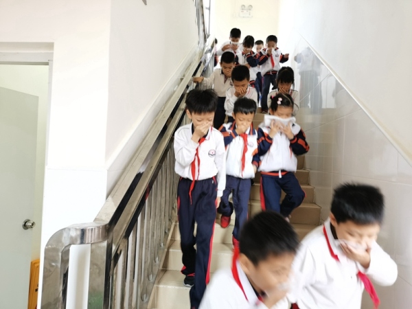 上午8點15分,警報拉響,演練開始。各班學(xué)生迅速有序出班,用準(zhǔn)備好的濕毛巾捂住口鼻,彎腰前行,按照各自逃生路線向安全區(qū)域疏散。正副班主任維持秩序、應(yīng)急疏導(dǎo),各樓梯及小道上的老師從旁指揮引導(dǎo)。學(xué)生們聽從指揮、行動迅捷,沒有驚慌失措的喊叫,也沒有一人摔倒。各個樓層負責(zé)任的老師進行最后確認,保證沒有一個學(xué)生滯留。整個過程做到了快速、安全、有序。