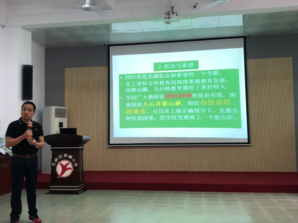 首先由郭上達(dá)校長(zhǎng)介紹了新來(lái)的同事,小結(jié)了暑假假期間學(xué)校的工作情況,蹦床隊(duì)的假期訓(xùn)練和比賽情況、功能室改造、新的課室等情況。對(duì)老師們提出了新學(xué)期的要求,傳達(dá)了區(qū)新學(xué)期教育工作的安排,對(duì)全體老師提出新的要求。郭校長(zhǎng)要求全體教職工以飽滿的熱情、積極的心態(tài)投入到新學(xué)期的教學(xué)工作中去。并對(duì)新學(xué)期的學(xué)校人事工作進(jìn)行了詳細(xì)的分工安排。接著就新學(xué)期每位教師的教學(xué)進(jìn)行了分工,并對(duì)教師的教學(xué)分工進(jìn)行了詳盡的解釋,他希望全體教師在各自的崗位上,團(tuán)結(jié)互助,積極創(chuàng)新,并在科研的基礎(chǔ)上出色地完成教育教學(xué)任務(wù)。與此同時(shí),他對(duì)老師們提出了五大目標(biāo)。隨后,德育、后勤等部門的主管行政也詳細(xì)地布置了開學(xué)初的有關(guān)工作。會(huì)議在兩個(gè)小時(shí)的時(shí)間里緊湊而有效地進(jìn)行著,大家認(rèn)真地聆聽著、記錄著,