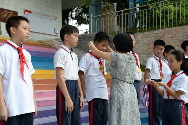 在莊嚴(yán)的升旗儀式后,六(4)班以“教師禮贊”為主題的詩(shī)歌朗誦拉開了活動(dòng)的序幕。六(3)班的學(xué)生也用優(yōu)美、整齊的手語(yǔ)舞《感恩的心》表達(dá)了對(duì)老師的深深敬意和濃濃的愛。接著,兩個(gè)班的學(xué)生代表向?qū)W校的全體老師送上了鮮花和節(jié)日的祝福,收到了這份驚喜的老師臉上都洋溢著幸福的笑容。隨后,李振華副校長(zhǎng)呼吁全體師生共同迎接第35個(gè)教師節(jié),讓濃濃的尊師情溢滿校園。最后,吳海棠主任對(duì)暑假參加2019年廣東省門球錦標(biāo)賽的獲獎(jiǎng)學(xué)生進(jìn)行表彰及頒獎(jiǎng),充分肯定了選手積極進(jìn)取和拼搏奮斗的精神,也寄望新隊(duì)員要刻苦訓(xùn)練再創(chuàng)輝煌。