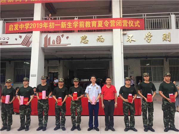 2019年8月29日下午,啟發中學初一新生學前教育夏令營閉營儀式正式拉開帷幕。參加本次閉營儀式的領導和嘉賓有:啟發中學校長謝永芳、城區消防中隊隊長蔡洋、啟發中學副校長祝玉珍、啟發中學副校長林容森、啟發中學教務處主任鄧小斐、啟發中學德育處副主任馬健媛;學校全體行政、全體教官、班主任和初一年級全體新生;部分新生家長也積極參加了本次閉營儀式。