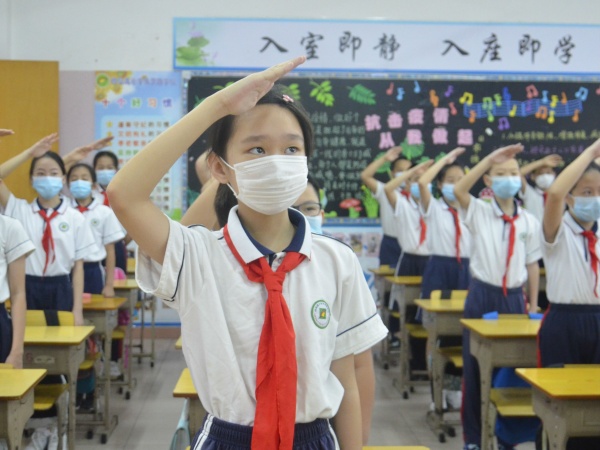 五星紅旗冉冉升起,師生們高唱國歌,心情澎湃。升旗儀式上,孫華校長以《努力做更健康更好的自己》為主題作旗下講話。她寄語同學們返校復學后要繼續做好防疫工作,重視身心健康,勉勵同學們繼續做“專注、堅毅、自律、自強”的四好孩子,用勤奮的汗水為生命增添色彩!