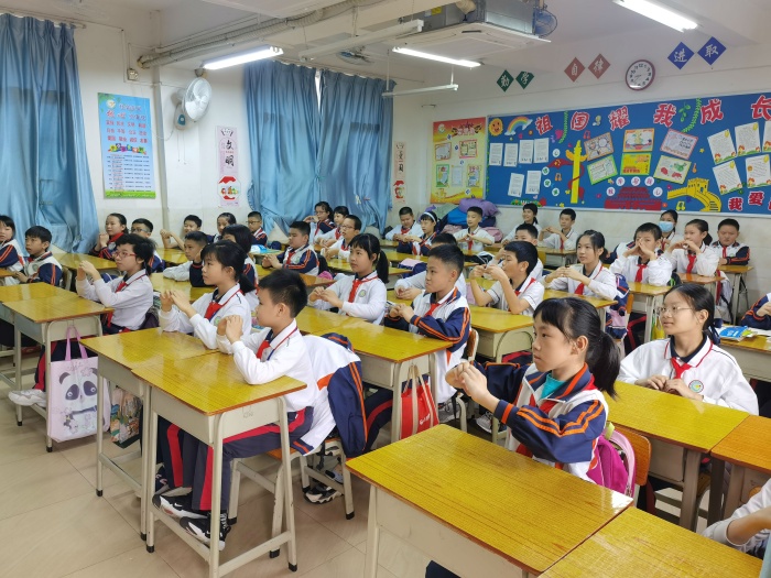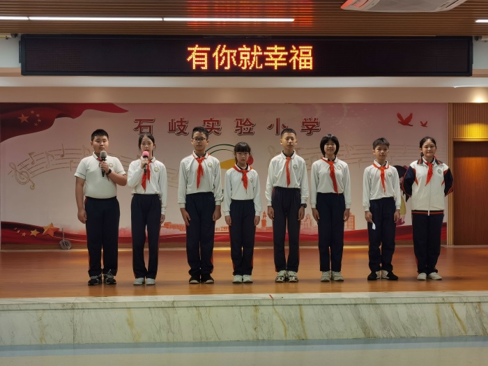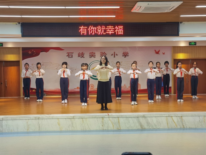 接著,伍金連老師帶領五(1)班的同學為全體學生獻上手語操《有你就幸福》。學生們伴著音樂一起學起了手語操,聽著音樂一起回想,每一次穿上新衣的時候,每一次上臺領獎的時候、每一次受到表揚的時候。會發現生活中原來擁有著這么多幸福的時刻。幸福是如此簡單,如此平凡,它總是不經意間就出現在我們的左右。