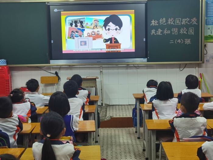 視頻講話中告訴學生校園欺凌是指同學間欺負弱小、言語羞辱及敲詐勒索甚至毆打的行為,主要表現形式有:索要錢物,不給就威逼利誘;以大欺小,以眾欺寡;為了一點小事就大打出手,傷害他人身體,侮辱他人性格;同學們因“義氣”之爭,用暴力手段爭短論強等。通過視頻學習讓學生了解什么是校園欺凌行為 ,并讓他們從小學會保護自己。觀看視頻后,各班針對本班的實際情況進行強化教育。