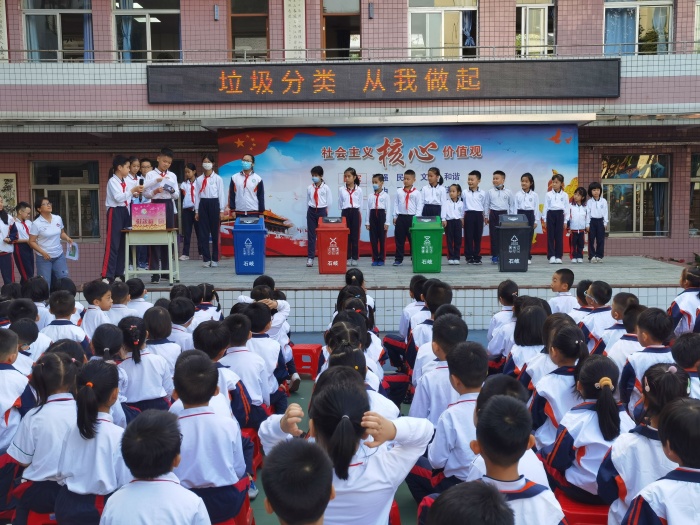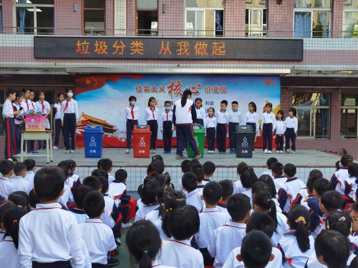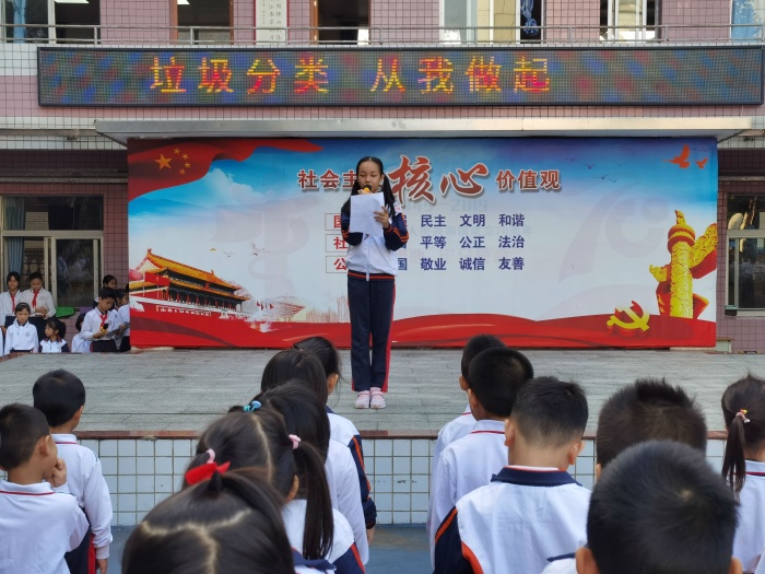 首先由六(5)班韋欣言同學進行國旗下講話,向全體同學宣讀垃圾分類倡議書,倡議全體學生樹立垃圾分類意識,爭當引領者;執行垃圾分類標準,爭當執行者;普及垃圾分類知識,爭當宣傳者;維護垃圾分類成果,爭當督導者。