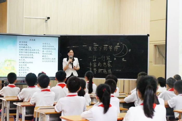 上午由石岐第一小學鄭素言老師帶來《星空下的等待》詩歌創作課例。課堂上鄭老師帶著石岐張溪鄭二小學四(5)班的孩子們探討創作兒童詩的秘訣,從故事繪本欣賞、想象力訓練、真實情感大膽表達三個維度開展,一步一步引導學生慢慢打開想象力的大門,創作出屬于自己的童詩童謠。接著,鄭素言老師的專題講座《詩路花語,且行且思》,在生動課例的呈現基礎之上,從孩子們喜歡的兒童詩、文學社十年詩教回顧、指導學生寫詩的秘訣、詩歌課題的設想四個方面講述了自身的詩歌教學之路,啟迪新語文教師們詩意課堂始于讀,啟于思,成于行。
