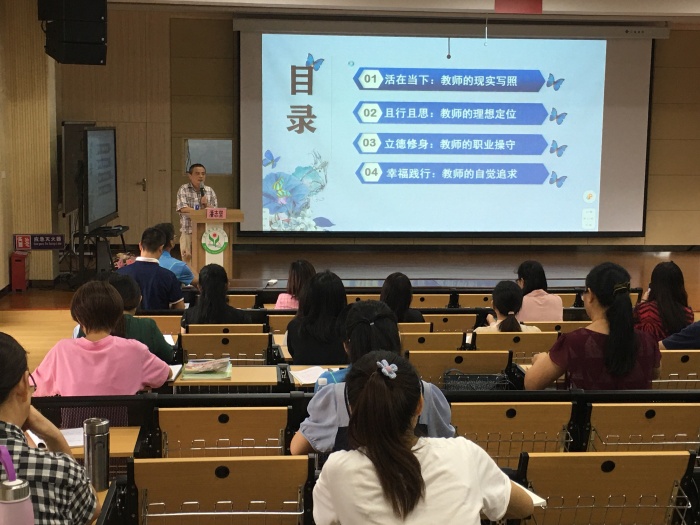 培訓主要從四個方面展開:教師的現實寫照、理想定位、職業操守、自覺追求。潘主任語言幽默,他以一組漫畫生動介紹了一名教師的忙碌日常,道出了人人稱羨的職業背后的無奈。接著,他回歸對教育工作的本質的思考,將深刻的道理寓于淺顯易懂的故事中,發人深省。隨后,潘主任與老師們分享了自己對“師德”的理解,他說:“師德,拆開來講就是師有理,德有道。”作為教育工作者,應該有理想和追求,教師的職業是具有幸福感的職業,每位老師都應該做一名幸福的教育工作者。潘主任也將幸福的法寶告訴了在座的老師們,那就是愛,時刻心懷愛,用一顆有愛的心對待身邊的所有人,那么幸福就會不期而至。