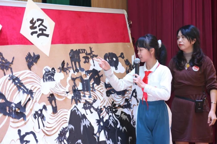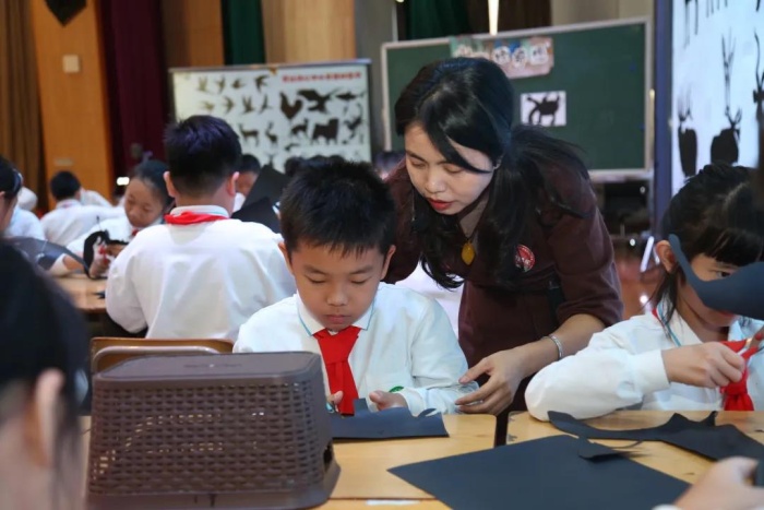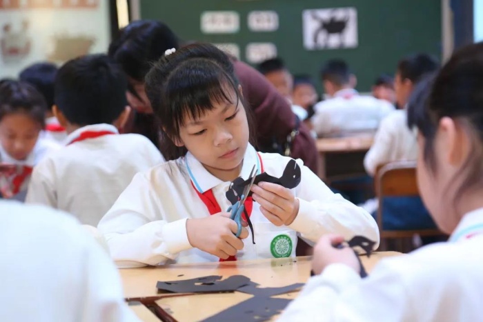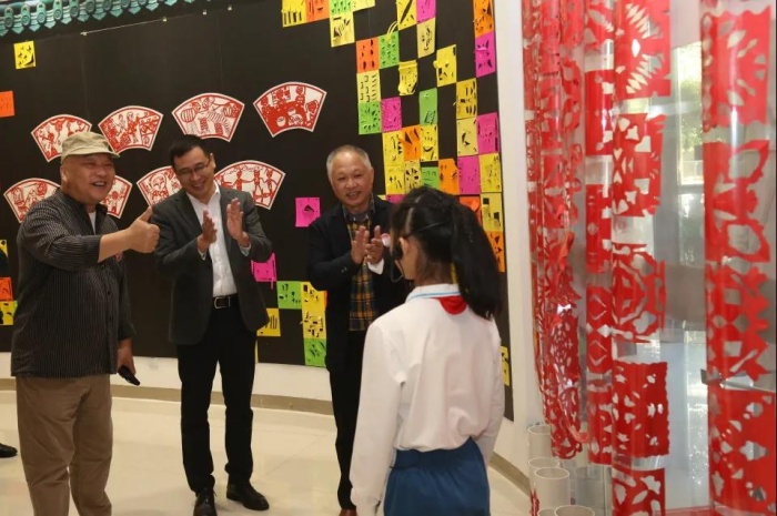 由于大信學(xué)校美術(shù)特色教育工作才開展得有聲有色,2021年學(xué)校被評為了“廣東省民間工藝美術(shù)特色學(xué)校實(shí)驗(yàn)基地”,由楊福軍老師擔(dān)任主持人。隨著“1——2——3”的口令,周鳳甫老師、鄭舒文老師、沈文老師、周文麗老師、馮冠祥校長和楊福軍老師共同揭開了這塊沉甸甸的牌匾,這同時也是學(xué)校美術(shù)工作的一個新的起點(diǎn)開始。揭牌儀式完成,隨即就是“百變剪紙”的開幕剪彩。新穎的剪彩形式,讓傳統(tǒng)和現(xiàn)代對接、讓激情和努力互溶,讓大信學(xué)校剪紙?zhí)厣虒W(xué)堅實(shí)的邁出了第一步。