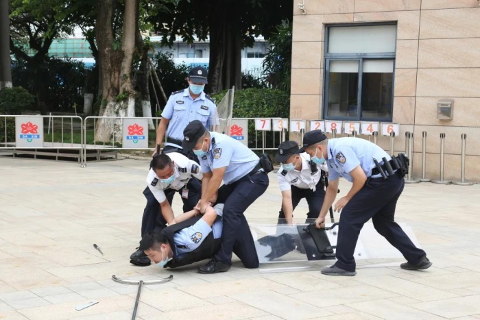 為提高全校師生面對(duì)暴恐事件的合理處理、自救自護(hù)能力,8月31日上午,石岐區(qū)公安局東河北派出所的警官來(lái)到大信學(xué)校,開(kāi)展以學(xué)校保安、教師所組成的最小應(yīng)急單元防恐防暴演練,全校教職工參與本次演練。