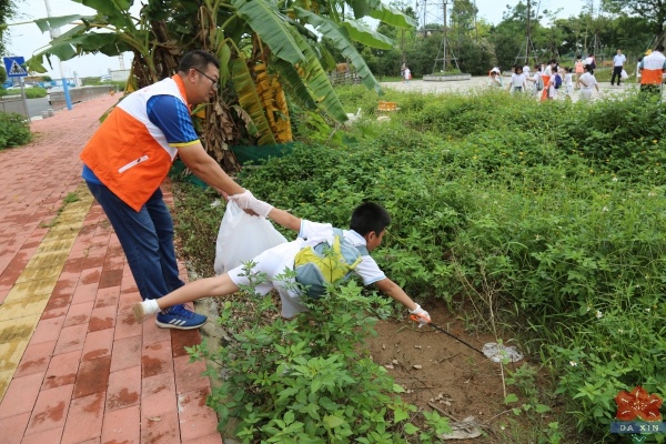 當天下午3時,學校親子志愿服務隊約100人與其他石岐區政府部門、社區、中小學親子義工隊組成的龐大志愿者團隊,分別來到各自指定的區域開展志愿活動,1000多名志愿者齊聚岐江河畔共同為岐江河梳妝打扮。