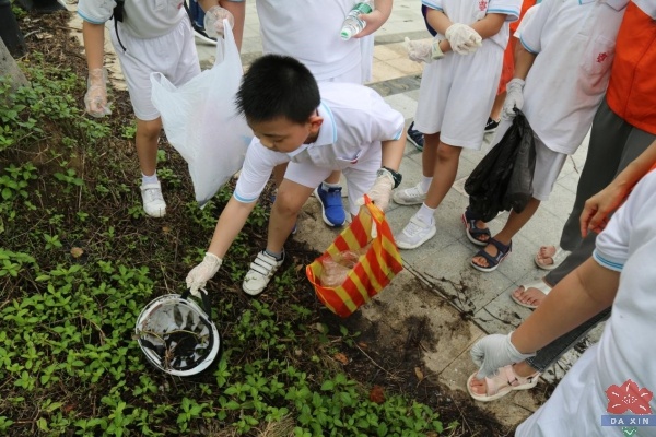 整個活動以班級為單位,大信學校一(3)班和二(3)班都有志愿服務小組及其組長。活動過程中,家長與孩子密切配合,積極主動的拿著垃圾袋,戴著手套把江邊的煙頭,塑料袋,飲料瓶等垃圾一一撿起。孩子們都覺得這樣的活動意義非凡,大家的積極性都很高,雖滿頭大汗,仍覺得樂意無窮。