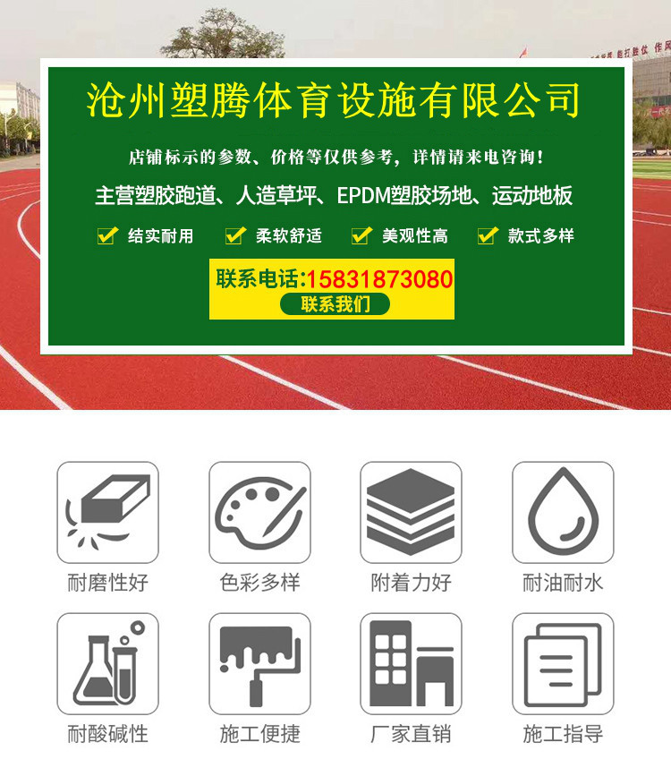 滄州塑騰體育設施有限公司――專業從事地面運動場地鋪裝,硅PU場地鋪設為基礎的專業團隊。??我公司擁有先進的工藝技術和機械加工設備。專業生產各種規格的人工草坪、EPDM彩色橡膠顆粒、膠水等。廣泛應用于塑膠跑道、籃球場、足球場、網球場、游泳池、體育場館運動地面、幼兒園防滑地面等。該產品具有綠色環保、色澤穩定且抗紫外線、耐磨損、彈性好,使用壽命長,易鋪設保養等優點。產品經上海和深圳檢測中心檢測,各項技術指標全部合格,達到行業標準。 我們本著以質量求生存,以周到的服務求發展,熱忱歡迎海內外廣大客戶和我們合作,攜手共創輝煌!