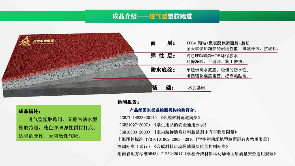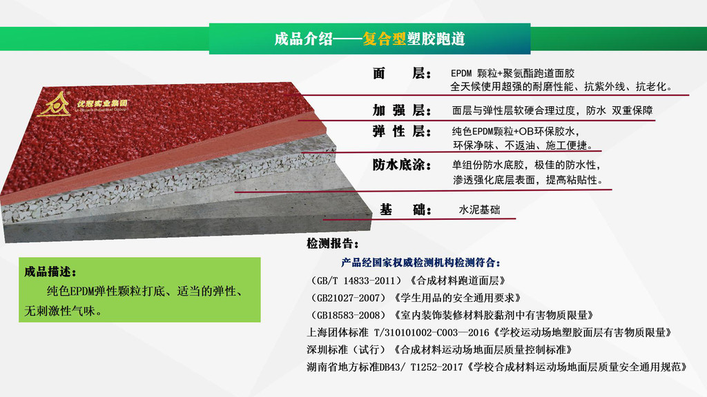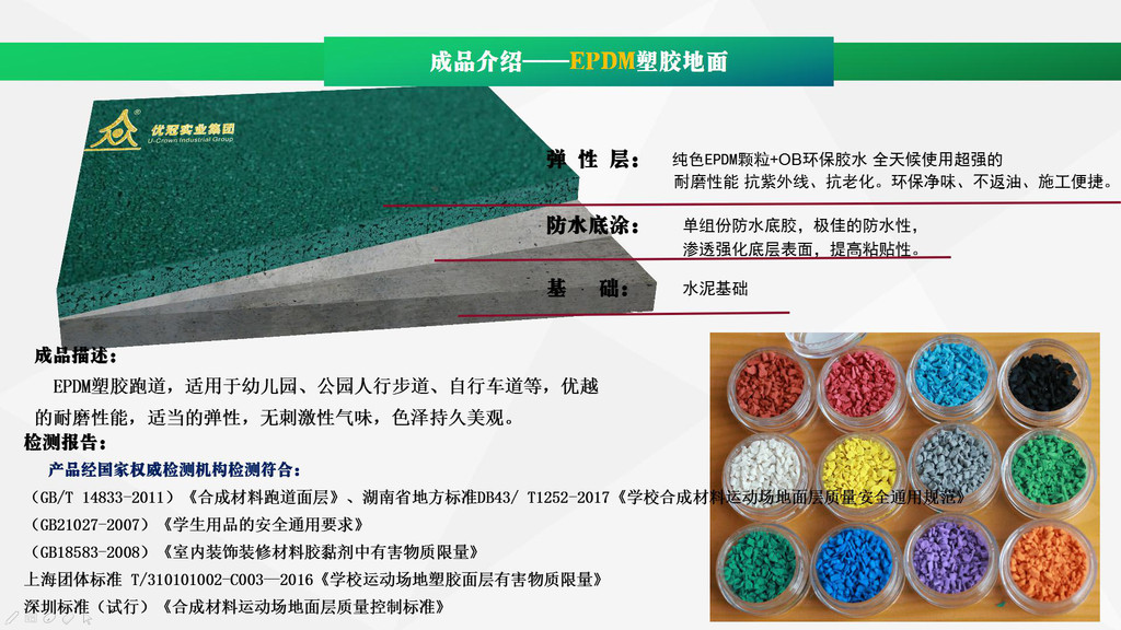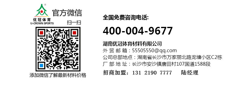優冠實業集團有限公司(以下簡稱集團)是一家專業從事運動場地材料,人造草坪研發、生產、銷售、鋪裝的科技創新型企業,是湖南省地方標準DB43/ T1252-2017《學校合成材料運動場地面層質量安全通用規范》主要起草單位之一。公司具備國際田聯(IAAF)認證、國際網聯(ITF)認證、中國環境標志產品認證、中國綠色材料標志授權使用證書、企業生產環評批復報告、安全生產標準化三級企業證書、對外貿易經營者備案登記表等,并成為湖南省政府采購協會會員。集團下轄湖南優冠體育材料有限公司、五舟體育設備制造有限公司、湖南康普斯人造草坪有限公司、湖南科迪環保科技有限公司、湖南優冠運動場鋪裝技術服務有限公司、湖南優冠塑膠體育工程有限公司。