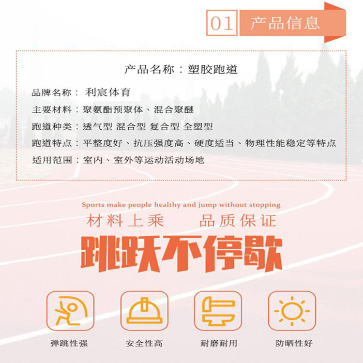 環(huán)保性:采用新型環(huán)保原料,不危害使用者健康;在材料配方上依據(jù)不同地區(qū)陽光紫外線的數(shù)據(jù)來調(diào)整使用紫外線吸收劑及抗氧劑等,能有效延緩老化;不易脫粒、開裂、起泡,從而極少產(chǎn)生影響環(huán)境衛(wèi)生的塑膠顆粒;耐摩擦、耐酸堿、耐老化,使用壽命長(zhǎng)。2、安全性:根據(jù)不同場(chǎng)地的要求,調(diào)整材料的厚度、彈性和摩擦系數(shù),以適合不同運(yùn)動(dòng)對(duì)安全的要求;彈性適度、防滑性好,能有效保護(hù)運(yùn)動(dòng)員的韌帶、肌肉、皮膚,以防拉傷或擦傷;適度的緩沖性可適度地吸收腳步的沖擊力,減少運(yùn)動(dòng)傷害。3、有效性:材料的各種系數(shù)的可調(diào)節(jié)性便于針對(duì)不同運(yùn)動(dòng)特性的場(chǎng)地使用能提高運(yùn)動(dòng)效率的材料;通過使用透氣、透水的材料和相應(yīng)的施工工藝,可滿足場(chǎng)地的全天候使用的要求,即使大雨剛過,也可立即投入使用;適度的彈性可減少體力消耗,從而可增加訓(xùn)練時(shí)間或增進(jìn)競(jìng)賽成績(jī);較強(qiáng)的抗釘力和耐壓縮性可將釘鞋、體育器械對(duì)場(chǎng)地的破壞減至少,使場(chǎng)地保持一貫的有效性;專業(yè)的施工和使用自流平材料,可使表面更平坦,從而更有效地訓(xùn)練和比賽;美觀的外觀和顏色搭配,在心理上對(duì)運(yùn)動(dòng)效率有積極作用。產(chǎn)品外觀:水白色或微黃色澄清透明液體