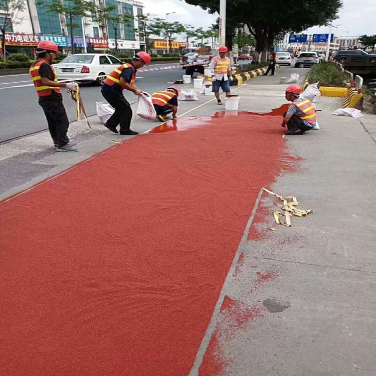 3、用透氣型噴面膠與EPDM膠粒、EPDM膠粉按規定比例配比,攪拌均勻,倒入專用噴涂機中,按順時針和逆時針方向分兩遍到三遍進行噴涂,固化后及為防滑耐磨層,現在普遍使用的顏色為紅色和綠色。