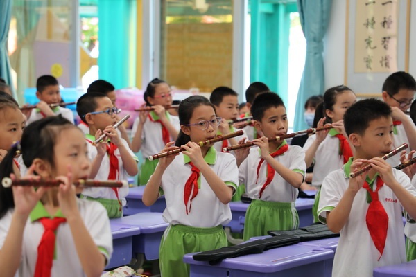 清晨的校園里隨處可見忙碌的身影,竹笛社團的孩子們在學校西門吹奏《青花瓷》《我愛你中國》《童年》等曲目,用優美旋律迎接各方來賓;南門名人園里,在鐘遠良老師的電子琴伴奏下,六2班袁鴻林、六5班劉馨瑜等幾位優秀竹笛學生代表輪番演奏《牧民新歌》《姑蘇行》等經典曲目;東門童趣園里,六6班全體學生吹響《每當我走過老師窗前》《紅星歌》等耳熟能詳的歌曲。