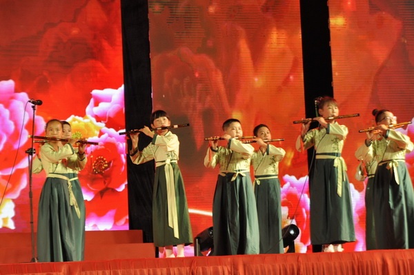 晚上7點30分,學校運動場燈光流轉, “綻放”十周年校慶文藝晚會準時開幕。開發區文體教育局局長趙云清、中山市教育招生考試中心副主任周勇、開發區教育事務指導中心主任鐘海清、副主任關影紅及區內各學校領導出席。本次晚會分為蓄力飛翔、感動十載、筑夢未來三個篇章,共13個節目。首先,在呂曉寧老師的指揮下,全體學生整齊起立,二至六年級共1800多名學生用手中的竹笛奏響《歡迎曲》,一年級的學生則用雙手打起節奏,現場千人合奏場面震撼,彰顯香暉園小學全面普及竹笛教育的成果。本場晚會,葉建林老師的竹笛獨奏《春到湘江》、呂曉寧老師指導的民樂合奏《金蛇狂舞》、竹笛合奏《揚鞭催馬運糧忙》以及余夢園老師指導的竹笛二重奏《跑旱船》等精彩的竹笛節目更是將小小竹笛的魅力呈現得淋漓盡致。此外,故事講演、情景劇、合唱、創意服裝秀等豐富多樣的節目更是精彩紛呈,現場氣氛熱烈。