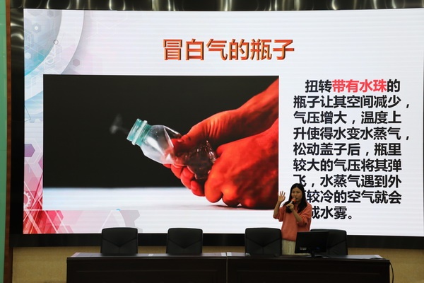 接著,該校的科學專職教師柳樺給同學們帶來了互動游戲——《瓶里吹氣球》。現(xiàn)場學生嘗試在不同大小的瓶子里吹氣球,高年級的同學鼓足了勁,臉蛋憋得通紅都沒能將氣球吹脹起來。柳老師借機換了一個帶孔的瓶子,再邀請低年段的學生參與,低年級學生輕而易舉地就把氣球吹脹起來,現(xiàn)場學生熱烈歡呼,觀看視頻直播的孩子們更是倍感神奇。趁著孩子們的激情高漲時刻,柳老師又給同學們播放了一段精彩的“氣壓實驗”視頻,最后又給同學們現(xiàn)場體驗了“讓針筒里的水重新沸騰”的實驗。學生在實驗中感受到了神奇的科學就在身邊。