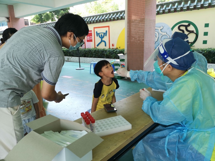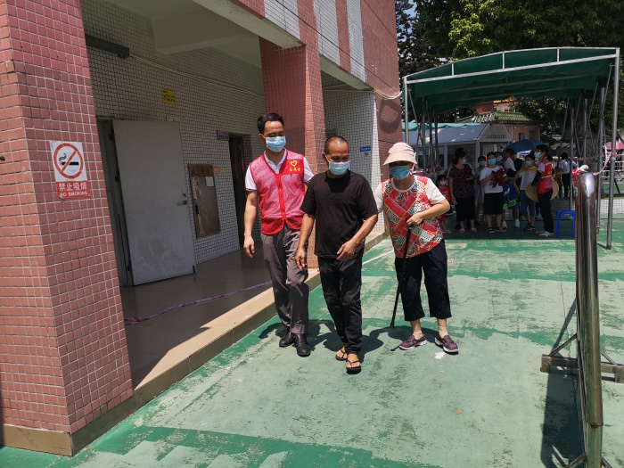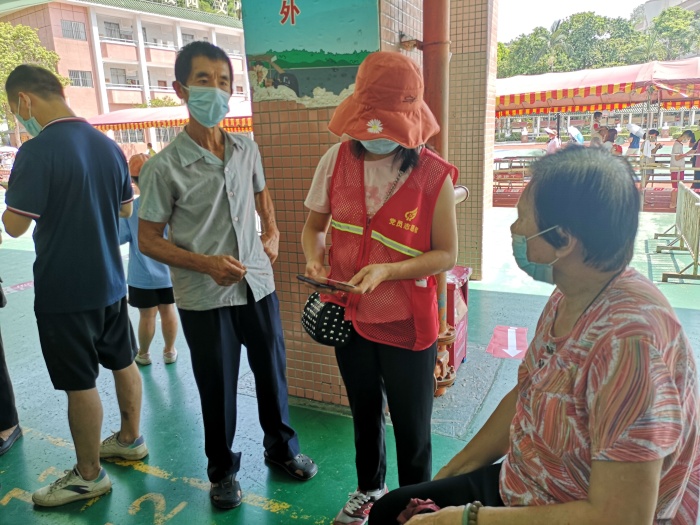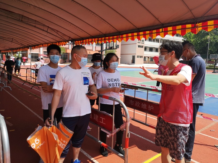 7月23日早點(diǎn)8點(diǎn),開發(fā)區(qū)第一小學(xué)張家邊三村核酸檢測(cè)點(diǎn)開始檢測(cè),開發(fā)區(qū)醫(yī)院10人和南方醫(yī)科大學(xué)南方醫(yī)院5人共同組成了此次開發(fā)區(qū)一小檢測(cè)點(diǎn)檢測(cè)團(tuán)隊(duì)。學(xué)校和村委為老人和兒童開設(shè)了綠色通道,方便了特殊人員的核酸檢測(cè)。在核酸檢測(cè)點(diǎn),開發(fā)區(qū)第一小學(xué)黨支部的黨員志愿者引導(dǎo)群眾有序排隊(duì)入場(chǎng),查驗(yàn)粵康碼、核酸碼,為老人及兒童填寫核酸碼信息,照顧年紀(jì)大的老人,指揮群眾有序離場(chǎng)?!澳鷦e急,我來幫你做”是回蕩在現(xiàn)場(chǎng)最多的話語,“汗流浹背”是現(xiàn)場(chǎng)工作人員的真實(shí)寫照。開發(fā)區(qū)第一小學(xué)張家邊三村檢測(cè)點(diǎn)預(yù)計(jì)今天要完成7200余份核酸采樣,截止中午12:00已完成3100余份采樣。
