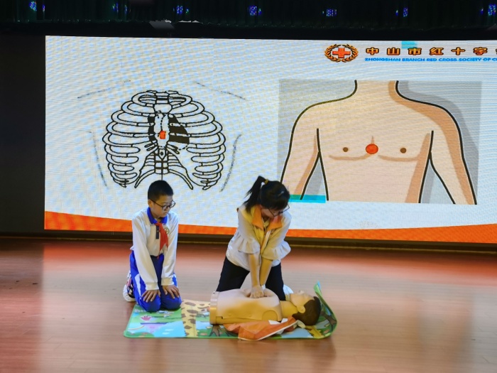講座中,鄭老師語言生動易懂,配合詳細的PPT展示、問答互動和現場的模仿操作,現場氣氛十分活躍,學生們積極參與其中。她尤其重點講解了在實際救援中,如何抓住最有效的“黃金四分鐘”時間,開展心肺復蘇救援。鄭老師為了讓模擬更加逼真,她結合模型,親身給學生示范如何正確進行心肺復蘇,告訴孩子們心肺復蘇的正確按壓部位和步驟,并邀請了學生上臺模擬。同學們興趣盎然,部分學生還上臺進行了互動交流,贏得現場掌聲陣陣。講座的最后,鄭老師呼吁同學們重視生命安全,學會科學施救。會后中山市紅十字會還為同學們分發了紅十字會宣傳手冊。