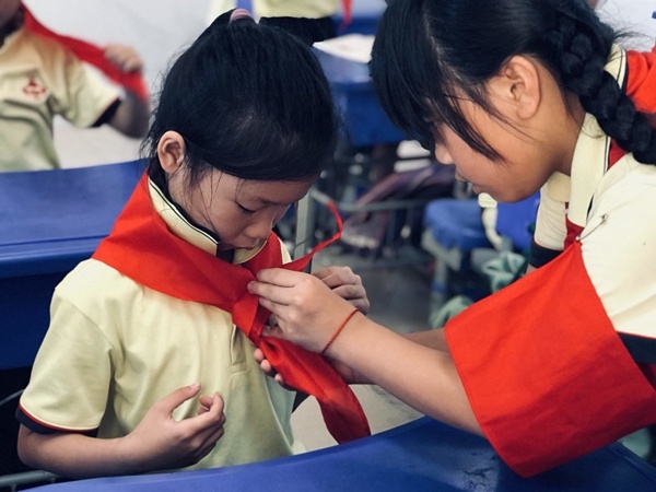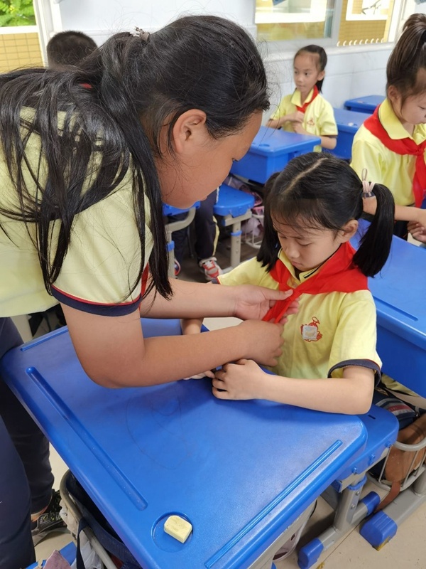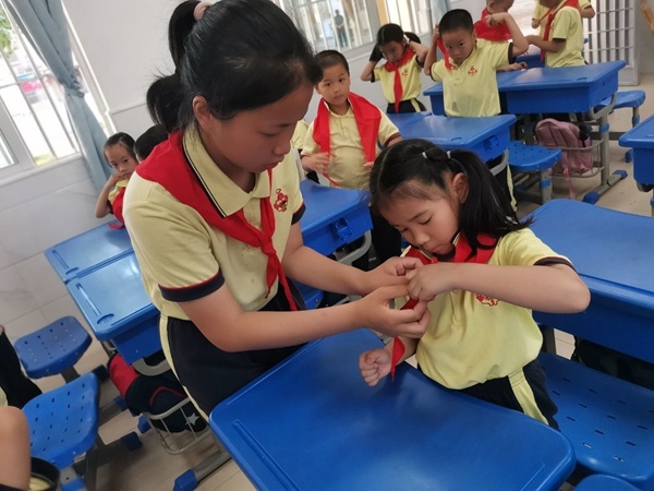 大隊委員們耐心地講解了中國少先隊組織機構、發展過程和歷史貢獻。詳細講解了“六知六會一做”的知識,并且手把手的一年級的弟弟妹妹們敬隊禮,佩戴紅領巾,學唱少年先鋒隊隊歌,如何宣誓和呼號等,一年級的小同學們聽的很認真,每一雙小眼睛都散發出渴望成為一名少先隊員的光芒。