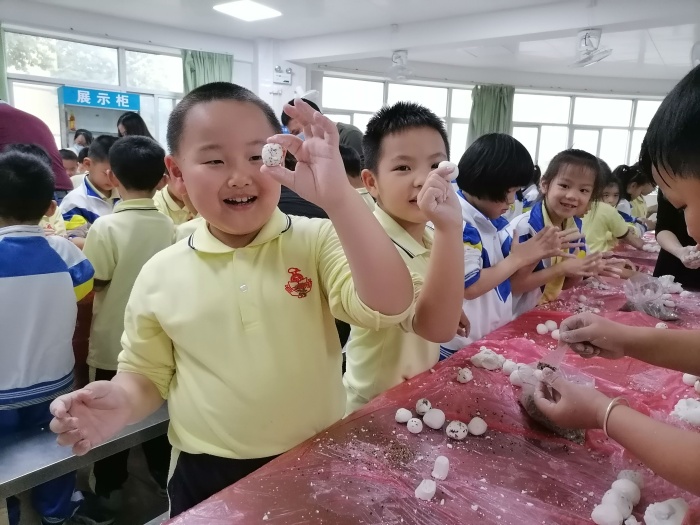首先,孩子們洗干凈雙手,挽起衣袖,有模有樣的學著爸爸媽媽的樣子包起湯圓:先拿和好的糯米粉團揪一小團,糯米面,讓孩子們擠壓成圓片形狀,再挑一團餡放在糯米片上,最后用雙手轉邊收口做成一個小圓球。看著一個個圓溜溜的湯圓真可愛!緊接著,煮湯圓時,先燒開水,把湯圓慢慢放入鍋內,輕輕的攪開,湯圓浮出水面代表已經煮熟。活動最后,家長伴著《賣湯圓》的優美旋律和孩子們一起品嘗著自己的勞動成果,每個人的臉上都洋溢著過節的喜慶。