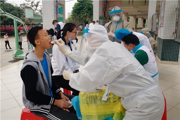 火炬區一中將自主文化廣場定為檢測場地,確保通風良好。受測學生從學校南門進入廣場,所有學生、工作人員進校前需做體溫篩查和查驗粵康碼,無粵康碼、非綠碼人員及體溫異常不可入校。檢測時要出示身份證或學生證(學籍號),需戴口罩。學校安排全程錄像。現場共分15列縱隊檢測,至下午4時左右,市疾控中心的工作人員完成全部檢測任務。