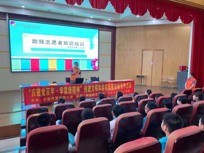 同時,為了更好地了解與幫助殘疾人士,火炬二中特邀同益社會工作服務中心的工作人員來到火炬二中進行“助殘志愿者知識培訓”,通過專題講座的形式,讓廣大師生能夠在生活中更加科學合理地幫助殘疾人士。