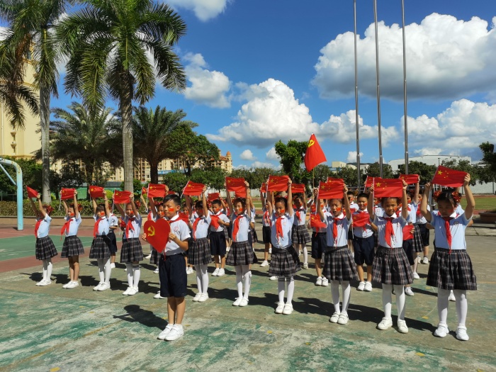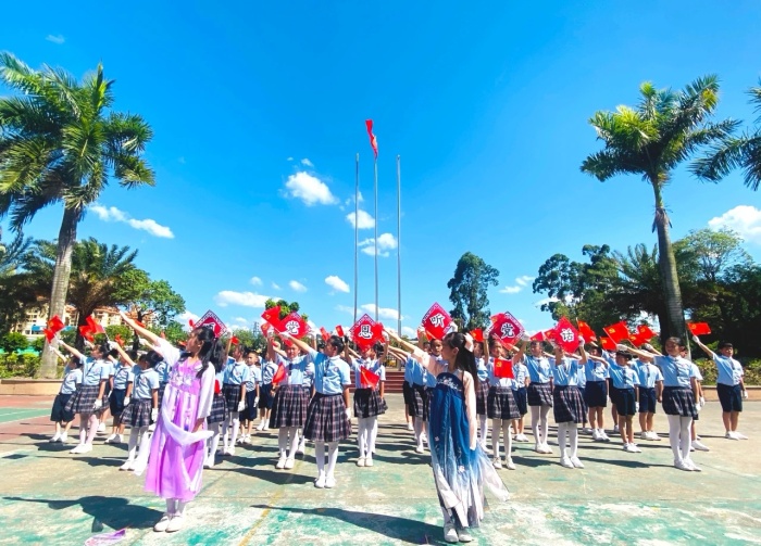 “今天是你的生日,我的中國……”“五星紅旗迎風飄揚,勝利的歌聲多么響亮……”“道可道,非常道;名可名,非常名......”伴隨著悠揚的旋律,同學們揮舞著國旗、黨旗,或歌或舞,或吟或誦,或書或畫,用不同形式抒發對祖國的美好祝福和對經典詩文的無限熱愛。“驛旅客逢梅子雨,池亭人挹藕花風。”韻律優美的《笠翁對韻》,一組對詞就是一句念白,一副對子就是一段唱腔,妙不可言,同學們在誦讀中不知不覺掌握對仗用韻,學會遣詞造句,奠定了國學根基。朗朗上口的《三字經》《千字文》《弟子規》節奏明快,更匯集古代圣賢思想,同學們在誦讀中傳承著少年養志、知書達理的中華文明。