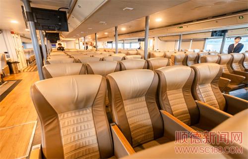 復航首日,新一代的全碳纖雙體高速客輪“鈺珠湖”號將為旅客提供客運服務,順德往返香港時間在1小時50分鐘左右。記者走進“鈺珠湖”號客輪內部,共有兩層,首層設置222個經濟艙客座,每排設置2-4個座位,餐廳、廁所、母嬰室一應俱全,為了給乘客安全和優質的客運體驗,客運航船內的母嬰室設有與經濟艙客座相同的座椅。
