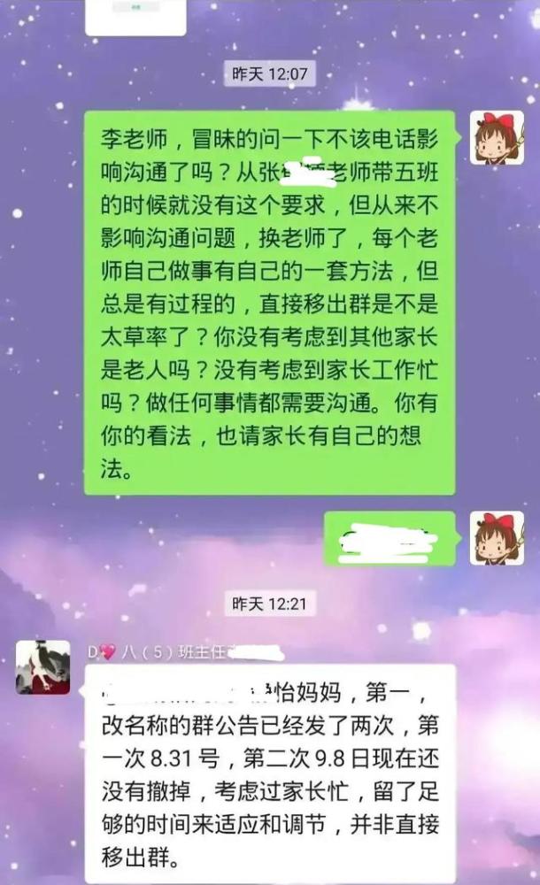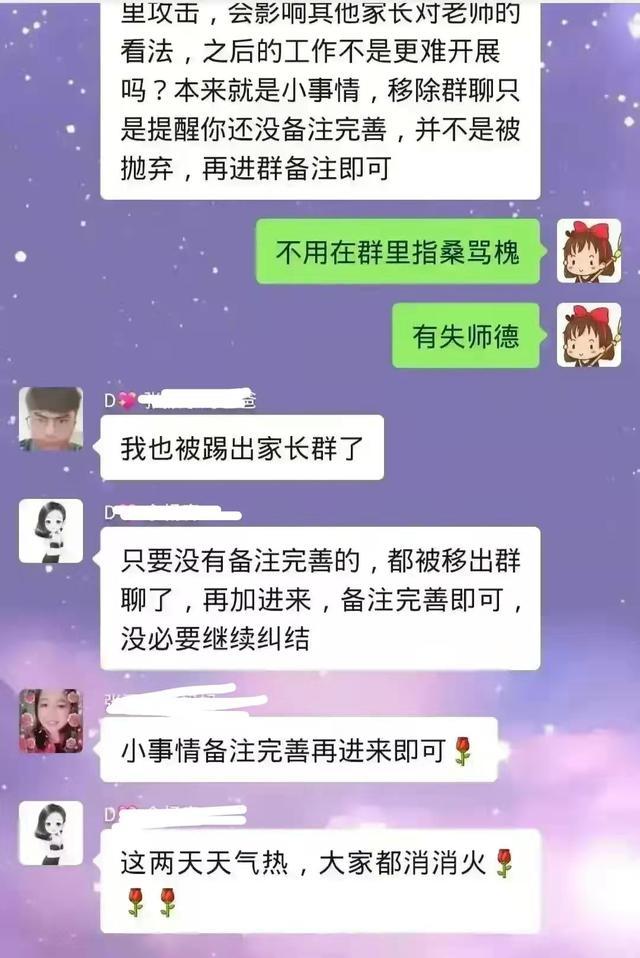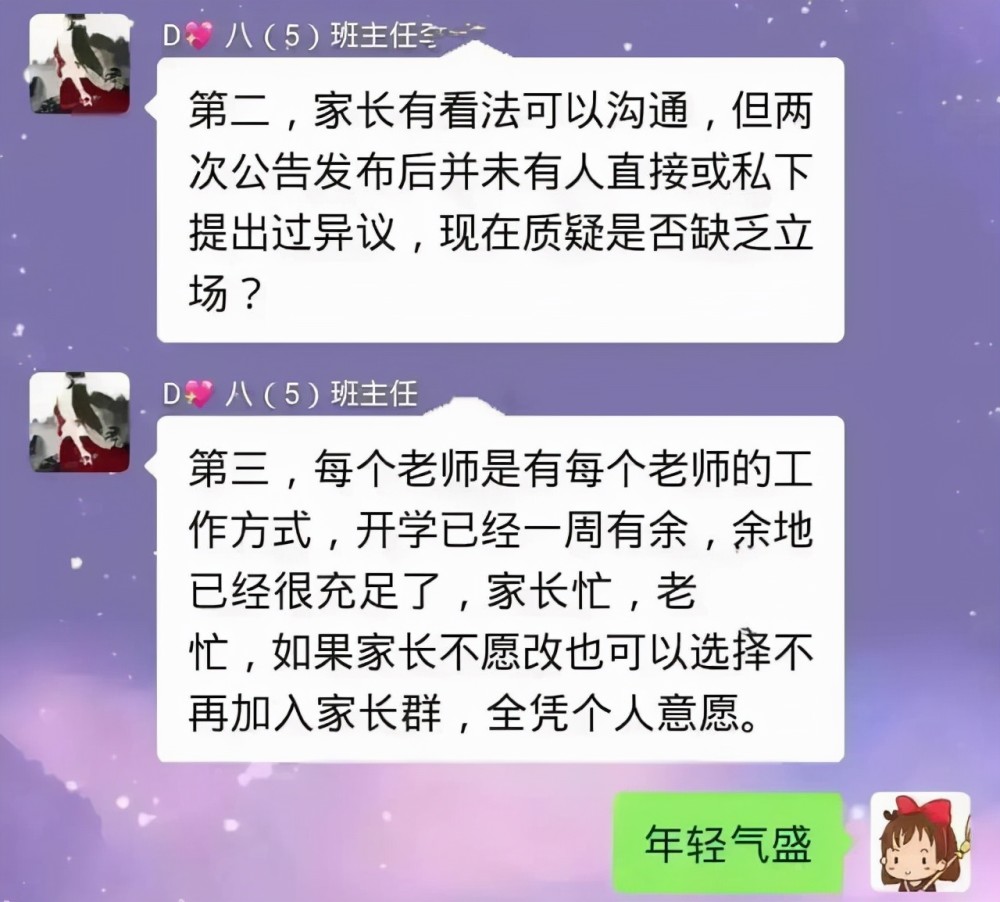 班主任說已經留夠充分的時間讓各位家長適應了,關于家長拒不配合被移出群聊,她曾發過兩次群公告提醒,并未有人提出過異議,如果家長拒不配合可以選擇不加入家長群。