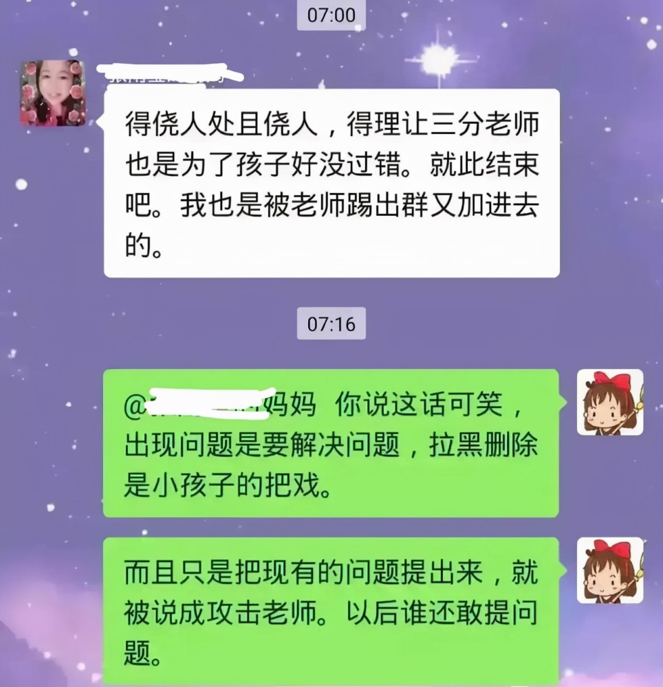 此時,也有其他家長朋友看不過眼、提醒這個跟老師抬杠的女家長,這是小事情,移出群聊只是提醒完善信息而已,并不是被“拋棄”。
