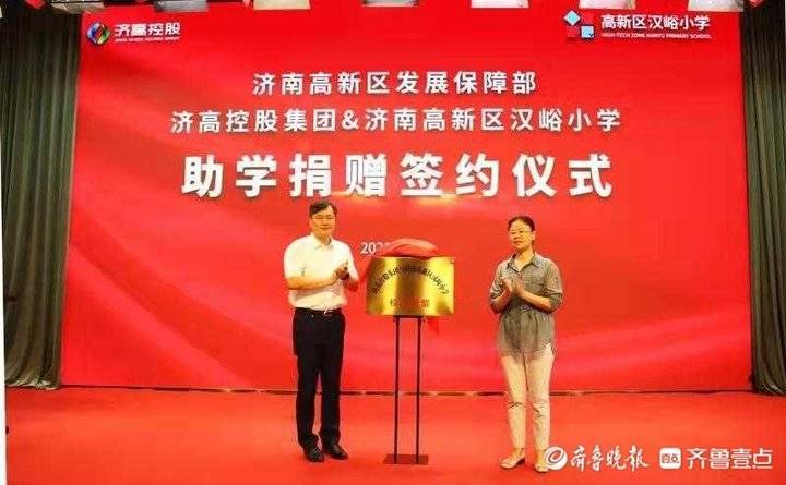 簽約儀式上,濟高控股東拓置業副總經理呂海波向漢峪小學捐贈圖書,漢峪小學組織人事部主任張丕娟代表學校接受了捐贈;高新區發展保障部部長助理、教體辦公室主任孫茜、濟高控股東拓置業總經理吳寶健、漢峪小學副校長崔心梅共同簽訂了助學捐贈協議;最后,裴長青和王賡共同為濟高控股與漢峪小學“校企聯盟”揭牌。