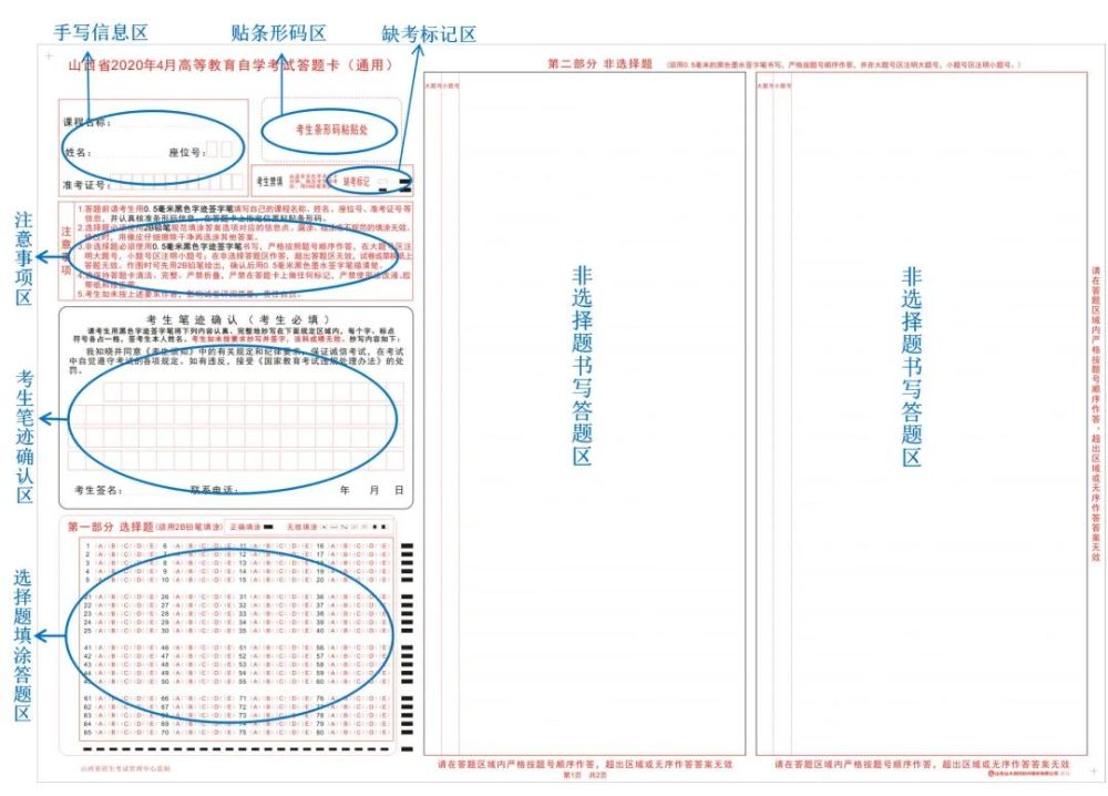 答題卡卡面包括:手寫信息區(qū);貼條形碼區(qū);缺考標記區(qū);注意事項區(qū);考生筆跡確認區(qū);選擇題填涂答題區(qū);非選擇題書寫答題區(qū)等部分。樣卡如下: