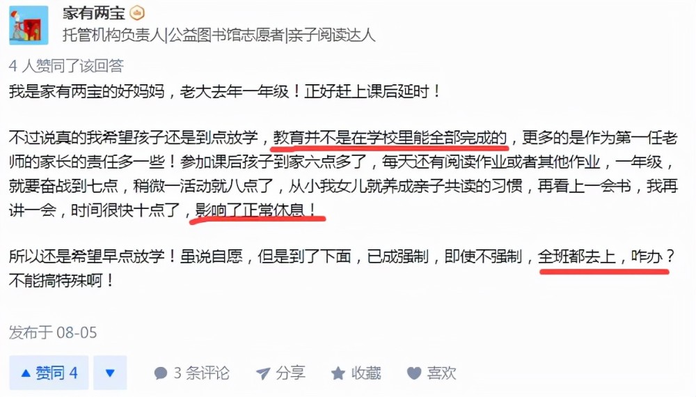 很多家長潛意識里覺得只要學生在學校,老師就要不停的講課,學生就不停的學習。實際上課后延時服務主要是為沒時間帶孩子的家長準備的。如果家長時間充裕完全可以按原放學時間接孩子放學,老師不會有任何偏見。