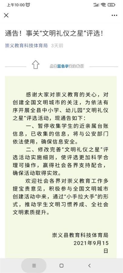 就在同一日,崇義縣教育科技體育局微信公眾號又發布了一條通告。通告稱,暫停收集學生的近親屬臺賬信息,已收集的信息,將與公安部門依法使用,確保信息安全;修改完善“文明禮儀之星”評選活動實施細則,使評選更加科學合理可操作。