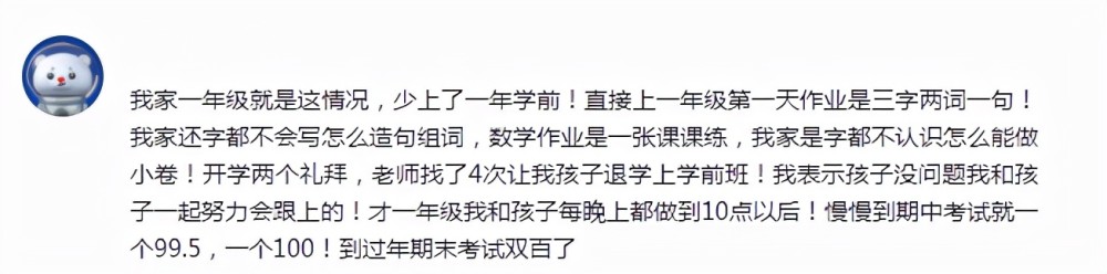 這位家長分享了自己孩子的遭遇后,有不少家長表示自己也經歷過類似的事情。一位家長稱,她孩子剛上一年級的那半個月被老師以同樣的理由勸退了4次,好在她一再堅持才保住了孩子的學位,并且在她的努力輔導下,孩子的學習很快跟了上來。