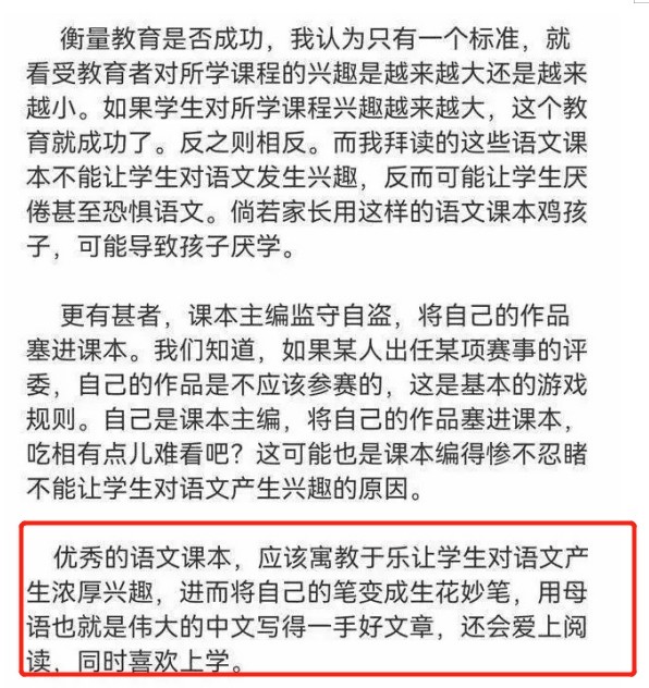 為了佐證語文教材選材上的問題,他還直言,課本主編利用職務之便將自己的文章塞進教材,有“監守自盜”的嫌疑。此外,鄭淵潔認為,語文課本應該讓學生對學習產生濃厚的興趣,愛母語,愛上學,而不是產生厭惡的心理。