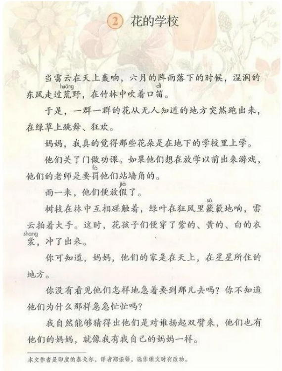 有家長指出,三年級上冊中摘錄了泰戈爾的作品《花的學?!?,雖然泰戈爾在國際上的知名度很高,他的這篇選文想象力很是豐富,但是其主旨不明朗,在內容上的描述上也是天馬行空,讓人不知所云。