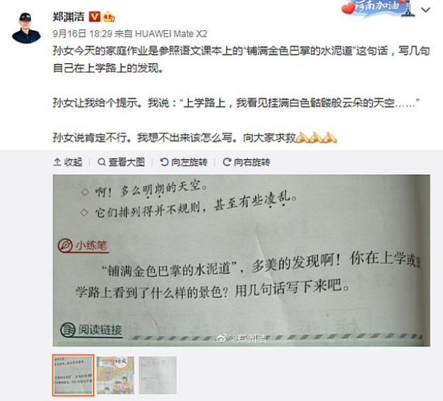 2021年9月中旬,鄭淵潔在個人賬號尋求幫助,他在輔導孫女寫作業的時候遇到了難題,希望網友們能幫他解答。他把語文書課后的圖片附在動態下方,通過這些圖片可以得知,難道他的題目內容是部編教材三年級上冊《鋪滿金色巴掌的水泥道》的語句仿寫。