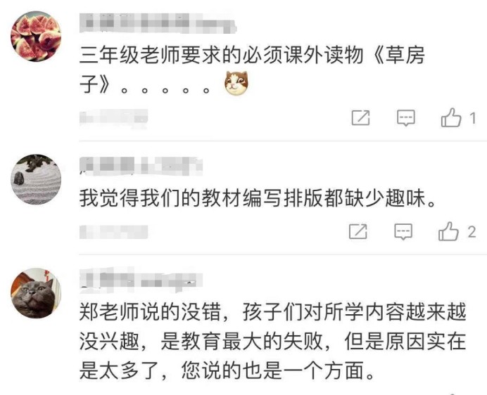 而在鄭淵潔質疑語文書的選材之后,評論區有不少家長紛紛響應。他們認為現在的語文書在選材上實在是莫名其妙,內容或者枯燥無味,或者深奧難懂,有些選文甚至有些莫名其妙,讓人不知所云。作為家長都看不懂選文的主旨,更不要說正在讀中小學的孩子們了。