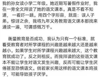 "衡量教育是否成功,我認為只有一個標準,就是受教育者對所學課程的興趣是越來越大還是越來越小?如果學生對所學的課程興趣越來越大,這個教育就成功了,反之則相反。而我拜讀的這些語文課本不但不能讓學生對語文發生興趣,反而可能會讓學生厭倦,甚至恐懼語文。”