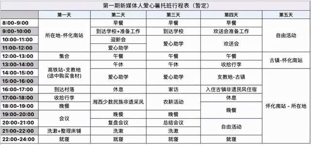 從下圖中的活動行程表可以看到,這個只有短短五天的活動,刨去第一天和最后一天的行車時間,以及第四天的歡送會,中間其實只有兩天的時間給孩子們“上課”,加起來滿打滿算也只有7節課。