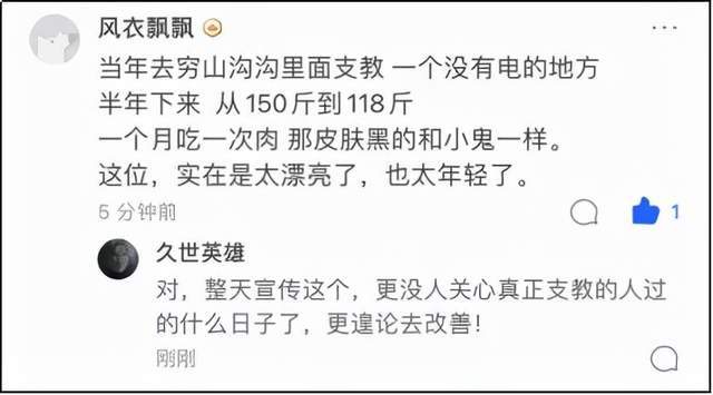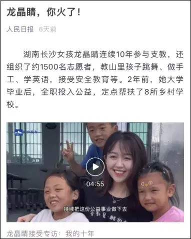 以上說的這些支教老師,沒有一個是像龍晶睛那樣,每年下鄉幾天,就把“十年支教”掛在嘴邊的;也沒有一個像龍晶睛那樣,聲稱做了十年支教,依然天天貌美如花妝不帶花的;更沒有一個像龍晶睛那樣,以支教的名義,去賺流量割韭菜的。