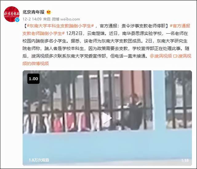 這樣的事情也絕對不是孤例,去年12月初,“支教老師踹倒小學生”的新聞也登上了熱搜。