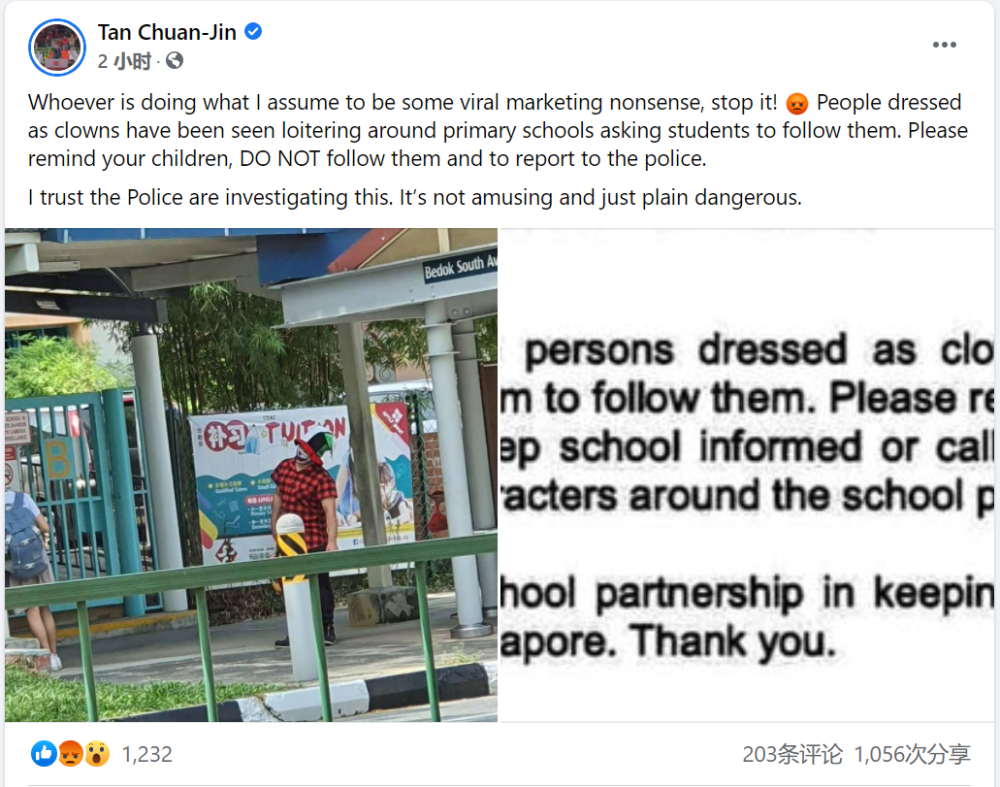 昨天下午,新加坡國會議長陳川仁在Facebook發文透露,這些小丑在校外游蕩,疑似是一家教育中心的宣傳策略,并對這樣的宣傳手法進行強烈譴責。