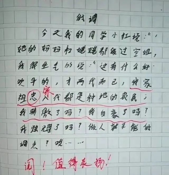 同學(xué)說自己姥姥和媽媽都是當(dāng)空姐的,該作者不服氣寫出:“這有什么好驕傲的,你家這才兩代而已,我家祖宗八代都是種地的我驕傲了嗎?”網(wǎng)友看到小學(xué)生犀利的話語不禁笑出聲:“八代農(nóng)民就是傲嬌啊!”