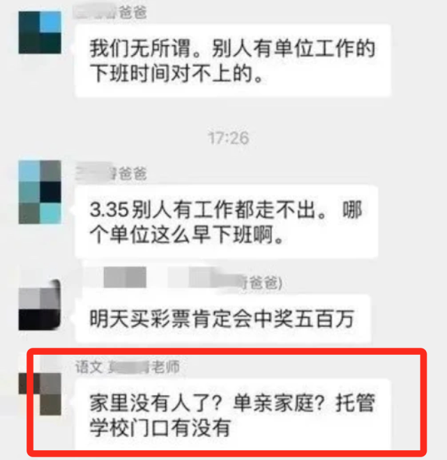 可是似乎是這位家長的話語激怒了班主任,班主任突然諷刺道,來上晚托班的孩子都怕不是家里沒人或者單親家庭吧。