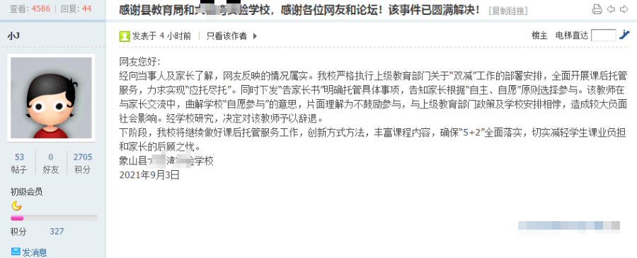希望這是第一個(gè)因?yàn)椤半p減”被開除的班主任,也是最后一個(gè),希望再遇到這樣的問題的時(shí)候,我們能有更好的解決方法,至少在家長老師的交流態(tài)度上要更和平一些。