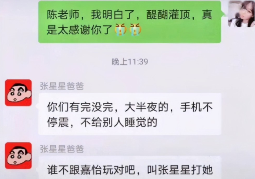 有了家長群,學(xué)生出現(xiàn)問題的時(shí)候,家長和老師經(jīng)常在群里討論。不過這天已經(jīng)接近半夜12點(diǎn)了,老師和一位家長還在談?wù)搶W(xué)生的表現(xiàn)。結(jié)果氣的張星星爸爸在群里回懟別人毫不留情,還直言叫張星星打架,真是沒誰了。